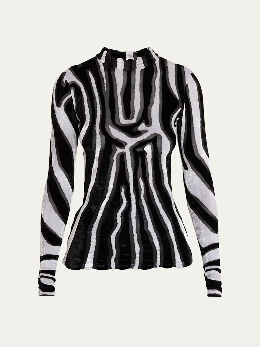 Balmain top is artfully crafted of a zebra velvet burnout Mock neckline Long sleeves Fitted Pullover style Viscose/elastane Professional cleaning recommended Made in Bulgaria Online Inquiries: BGS21_BB0JT| Store Inquiries: #5387408
