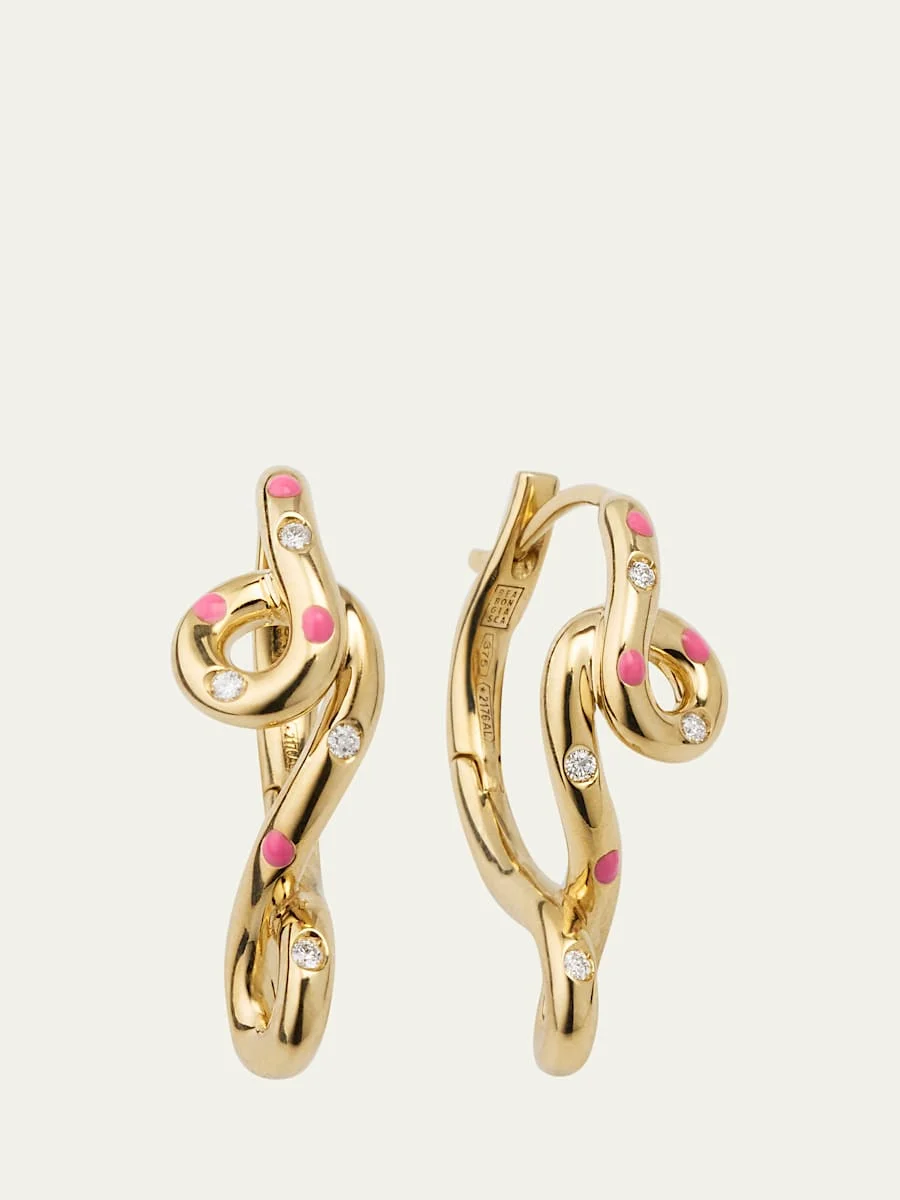 Bea Bongiasca sculptural hoop earrings Approx. 1.5"L Etched 9-karat yellow gold Bubblegum pink enamel Butterfly backs for pierced ears Handmade in Italy Online Inquiries: BGS21_Y6NDR| Store Inquiries: #4619155