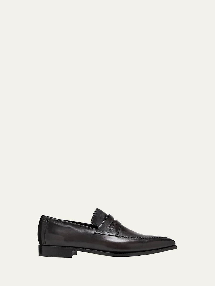 Berluti loafers with penny keeper strap. Stacked heel. Square apron toe. Notched vamp. Slipon style. Leather lining and sole. "Andy" is made in Italy.