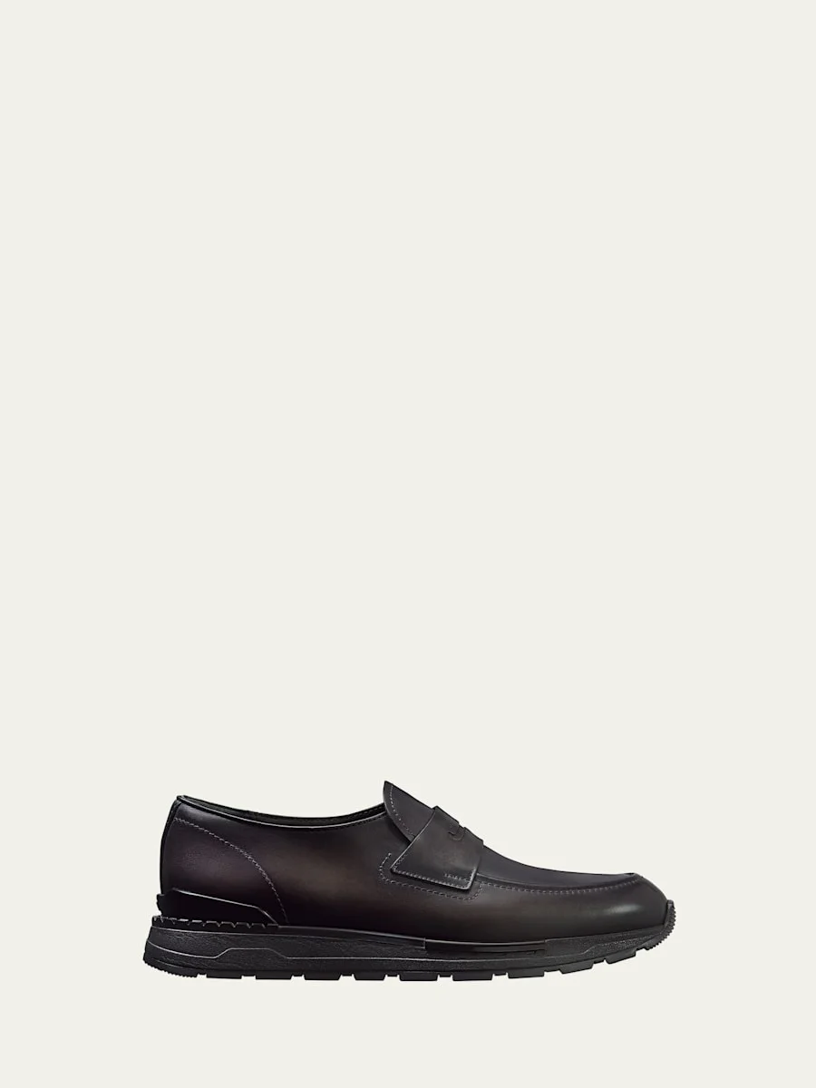 Berluti "Fast Track" loafers in smooth calf leather Flat heel Reinforced round toe Penny strap at vamp Embossed heel logo Lugged rubber outsole Slip-on style Made in Italy Proposition 65 warning for California residents Online Inquiries: BGS21_NCLES| Store Inquiries: #4909369