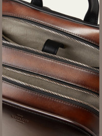 Berluti "Working Day" backpack in premium leather features signature Scritto motif Approx. 15.3"L x 5.5"W Top carry handle Two main zip compartments Double zip closures Debossed logo at front Front zip pocket Two adjustable padded shoulders straps Padded back mesh panel; slip pocket Internal slip pocket; snap tab Internal zip pocket Calf leather/polyester/brass Made in Italy Online Inquiries: BGS21_N9B9B| Store Inquiries: #4328562