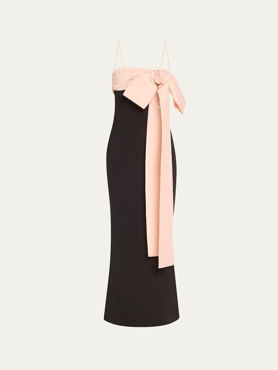 A contrasting bow on the bodice elegantly defines BERNADETTE gown May be styled with hidden straps Square neckline Sleeveless Falls below the ankle Column silhouette Polyester/nylon/polyamide/elastane Dry clean Made in Romania Online Inquiries: BGS21_B9SG9| Store Inquiries: #4955990