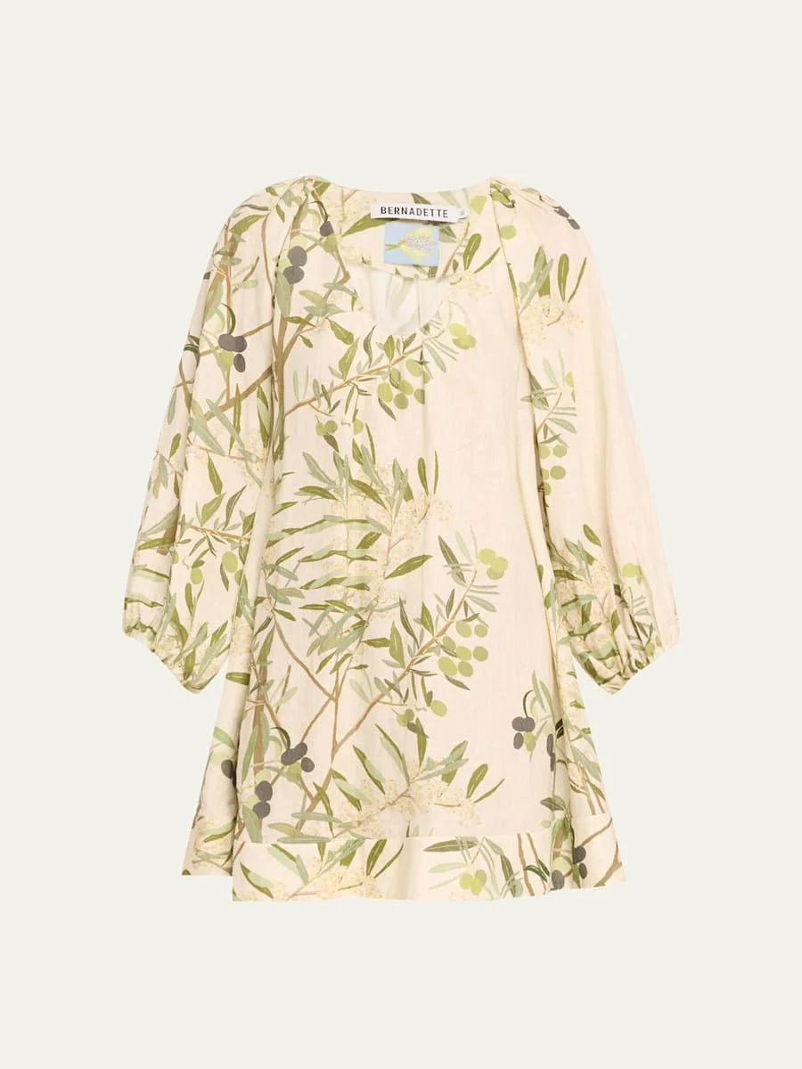 Flowy Puff-Sleeve Printed Linen Mini Dress