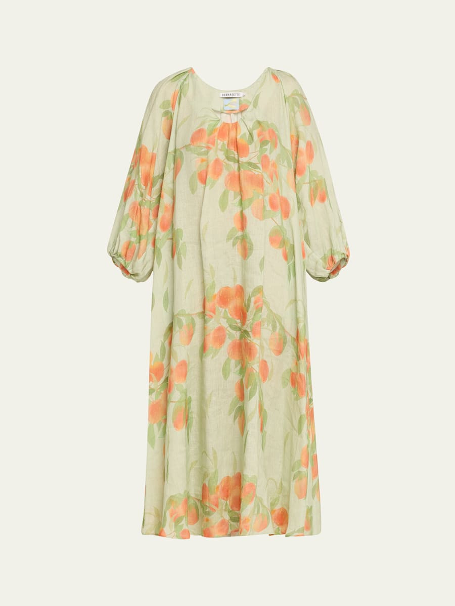 BERNADETTE "Georgio" classic dress cut from light linen in an allover peach print V neckline Long puff sleeves; gathered cuffs Side seam pockets Hem hits below the knee Loose silhouette Slipover style Linen Dry clean Made in Romania Online Inquiries: BGS21_B9SFZ| Store Inquiries: #4955980