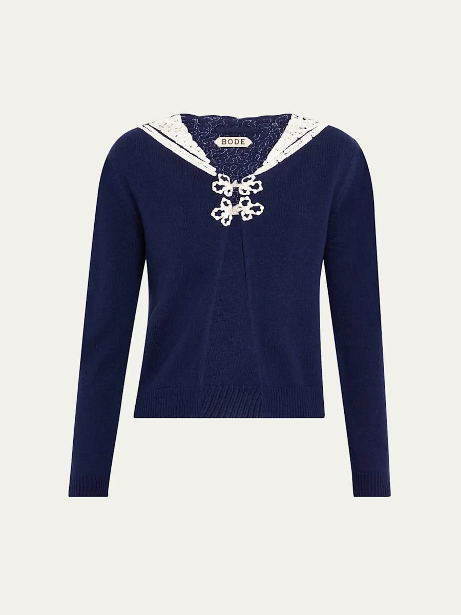 Bode "Astoria" cardigan is inspired by a handmade costume from the late 1960s - early 1970s with a reproduced sequin-embellished sailor collar and star accents Frog closure Long sleeves Relaxed fit Cotton/cashmere Imported Online Inquiries: BGS21_B9K4V| Store Inquiries: #4888941