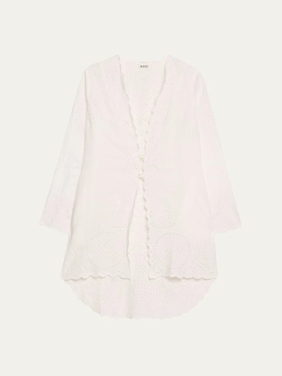 Bode "Belvoir" top is made up of broderie anglaise lacework with scallop trim V neckline; frog closure Long sleeves Relaxed fit Rounded hem Linen Imported Online Inquiries: BGS21_B9K5A| Store Inquiries: #4888956