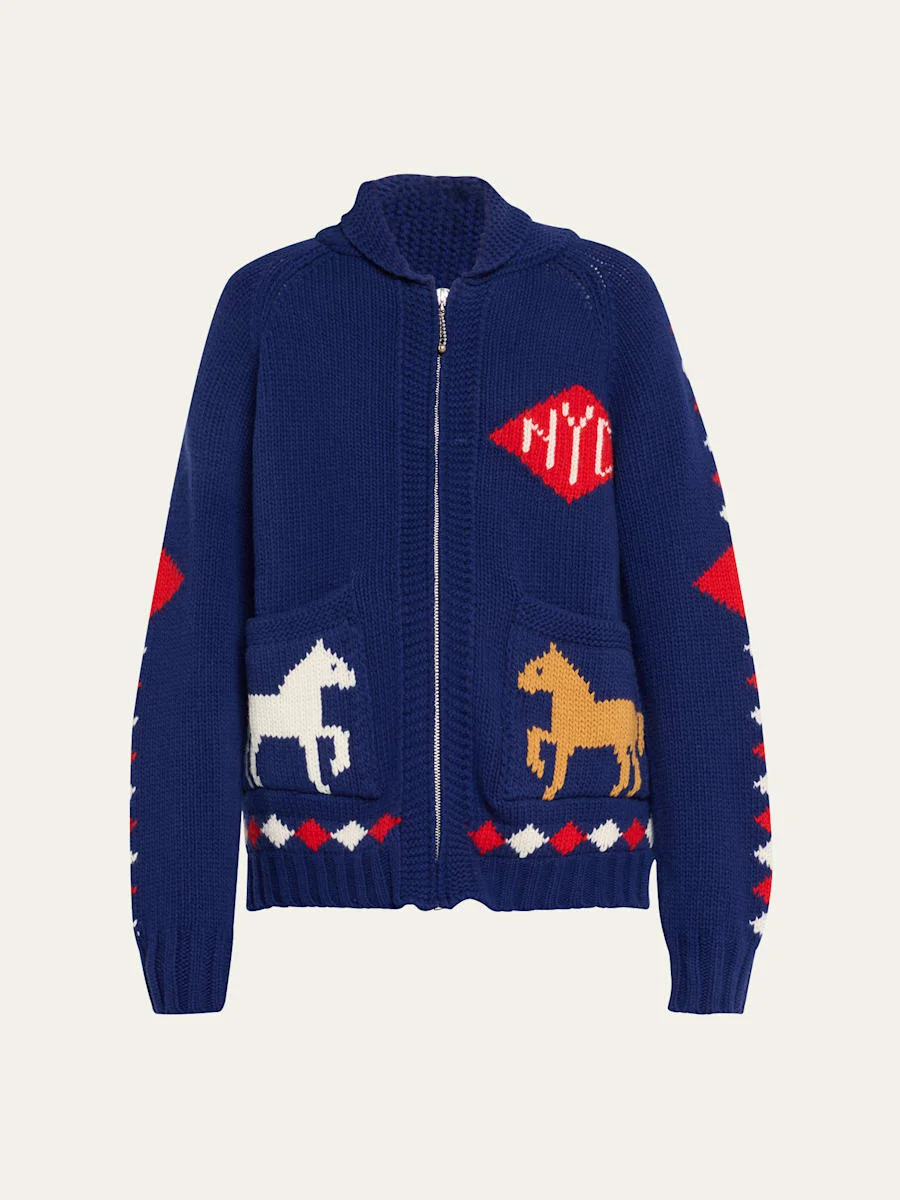 Bode "Diamond Corral" handknit cardigan features a horse motif intertwined with a twotone diamond pattern Shawl collar; zip front Long sleeves Front patch pockets Relaxed fit Pullover style Merino wool Made in Romania