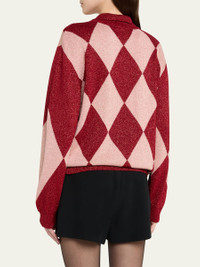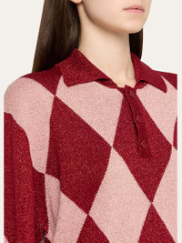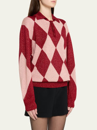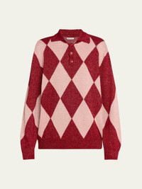 Bode "Jockey" polo sweater showcases a classic argyle pattern Spread collar; button placket Long sleeves Boxy fit Pullover style Viscose/metallic fibers Made in Romania Online Inquiries: BGS21_B9K4T| Store Inquiries: #4888939