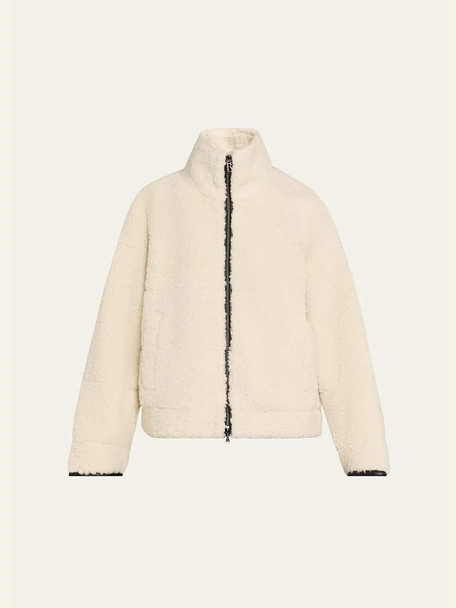 Crafted from plush teddy fleece, the "Katleen" jacket by Bogner is finished with faux leather trim for a modern look. Wide collar Dropped shoulders Long sleeves Side welt pockets Oversized fit Elastic drawcord hem Twoway zipfront Polyester Lining: Cotton Dry clean only Imported