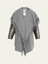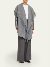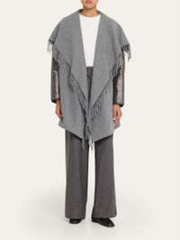 Crafted from a woolblend, the "North" poncho by Bogner is adorned with fringe trim and padded nylon sleeves for a modern, combo silhouette. Shawl collar Long sleeves Signature 'B' logo patch on the left sleeve Classic fit Hem falls to the hip Openfront Wool/nylon/polyamide Hand wash or dry clean Made in Italy