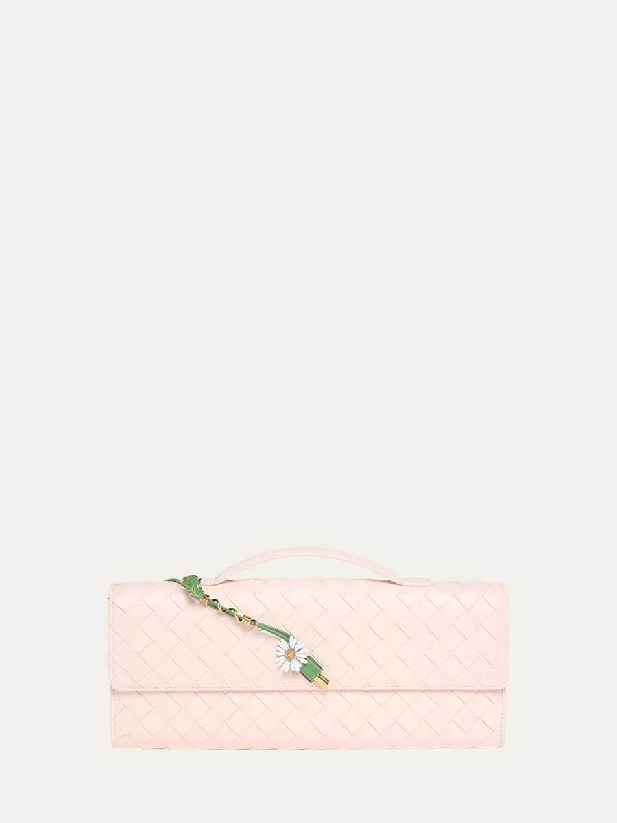 Bottega Veneta "Andiamo" clutch bag in intrecciato nappa leather with enameled flower embellishment Top handle Can be worn as a top handle or clutch bag Flap top with metal knot accent Interior, six card slots and one slip pocket Approx. 5.1"H x 12.2"W x 1.2"D Made in Italy