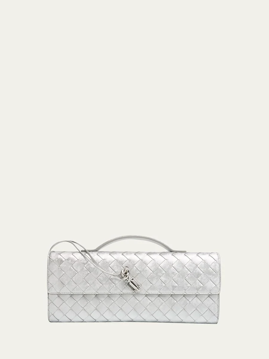 This Bottega Veneta "Andiamo" clutch bag is crafted in intrecciato laminated leather with a shiny satin finish Flat top handle, 0.8" drop Flap top with metallic knot closure Interior, six card slots, one slip pocket Lambskin leather lining Approx. 5.1"H x 12.2"W x 1.2"D Made in Italy