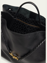 Bottega Veneta "Andiamo" tote bag in silky calf leather Top handle Sliding shoulder strap with knot hardware accent Can be worn as a top handle or shoulder bag Open top Interior, one zip pocket and one card slot Lining: Suede Feet protect bottom of bag Approx. 13.7"H x 16.5"W x 7"D Made in Italy Online Inquiries: BGS21_V6BLV| Store Inquiries: #4872936