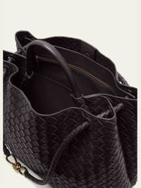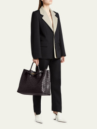 Bottega Veneta "Andiamo" tote bag in intrecciato napa leather Rolled top handle Open top with magnetic closure; center adjustable knot strap Interior, one zip pocket and one slip pocket Approx. 13.8"H x 16.5"W x 7.1"D Made in Italy