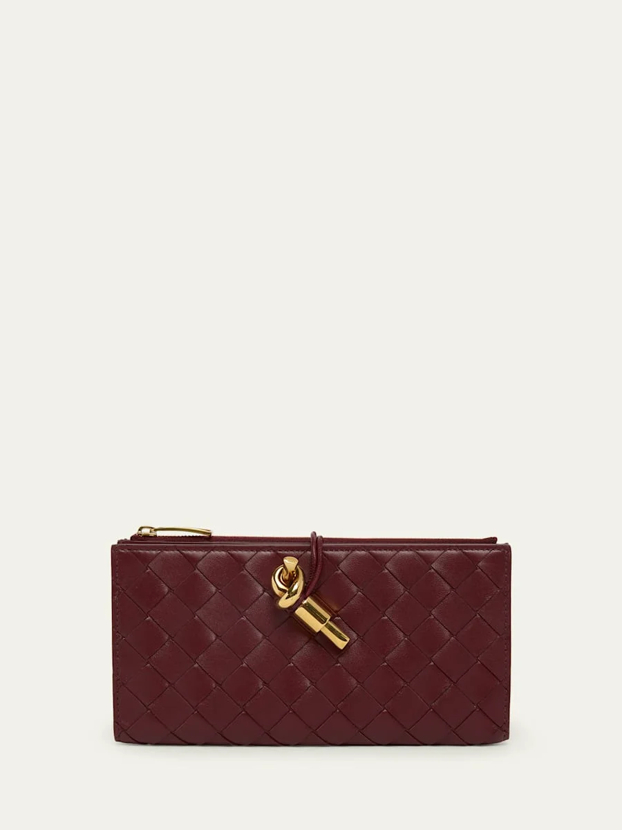 Bottega Veneta "Andiamo" long wallet in intrecciato nappa leather Metallic knot closure Interior, twelve card slots, two slip pockets, and one zip pocket Lining: Leather Approx. 3.7"H x 7.5"W Made in Italy