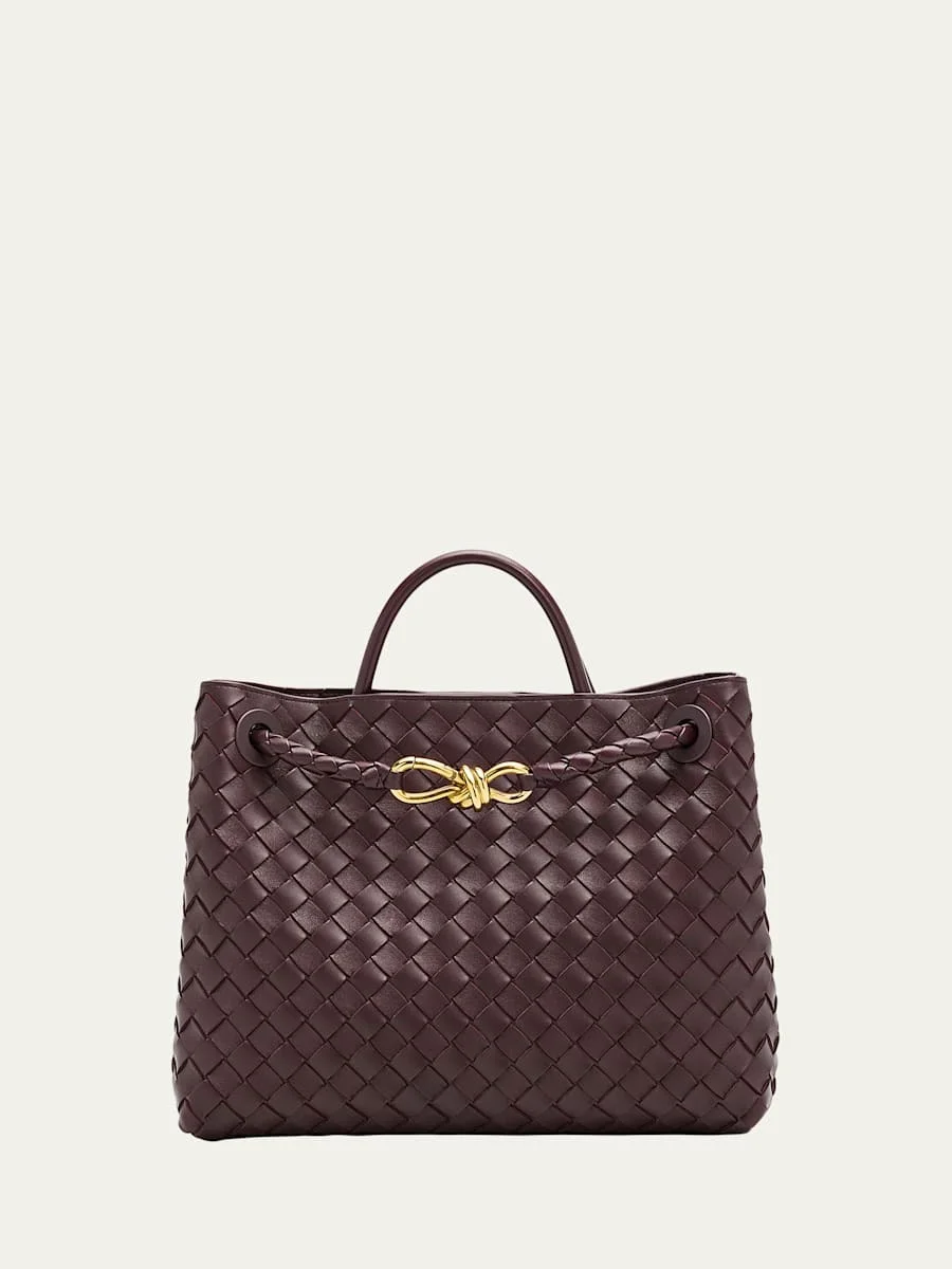 Bottega Veneta "Andiamo" top handle bag in intreccio lambskin leather Rolled top handle, 3.5" drop Shoulder strap Can be worn as a top handle or shoulder bag Open top with magnetic closure; metal knot center strap Approx. 9.8"H x 11.6"W x 4.3"D Made in Italy