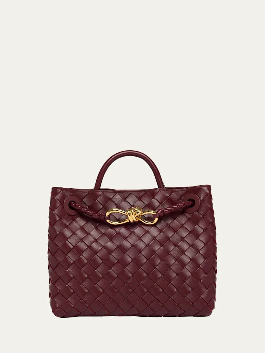 Bottega Veneta "Andiamo" tote bag in intrecciato leather Top handle, 2.4" drop Adjustable crossbody strap Can be worn as a top handle or crossbody bag Open top with magnetic closure; center knot accent Interior, one zip pocket and one slip pocket Approx. 7.9"H x 9.6"W x 3.9"D Made in Italy