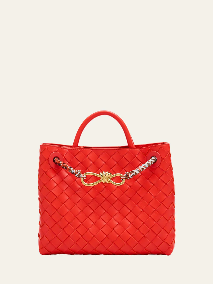 This iconic "Andiamo" top-handle bag from Bottega Veneta is crafted in intrecciato leather and elevated by the braided strap and signature knot detail Softly structured silhouette with rounded sides Rolled top handle, 2.4" drop Sliding braided leather shoulder strap, 19.7" drop Can be worn as a top handle or shoulder bag Open top with magnetic closure Interior, one zip pocket and one slip pocket Approx. 7.9"H x 9.8"W x 3.9"D Made in Italy Online Inquiries: BGS21_V6L71| Store Inquiries: #5037175