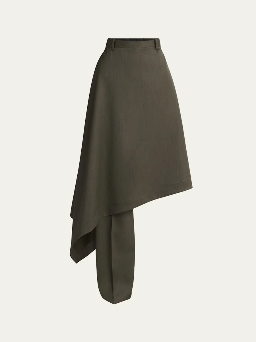 Bottega Veneta skirt with a trouser leg and asymmetrical silhouette in subtle chevron melange wool Sits high on the waist Hem falls below the knee Side pockets; back welt pocket A-line; straight leg Zip, hook and button closure Belt loops Wool/silk/acetate Made in Italy Online Inquiries: BGS21_B9W4C| Store Inquiries: #4985829