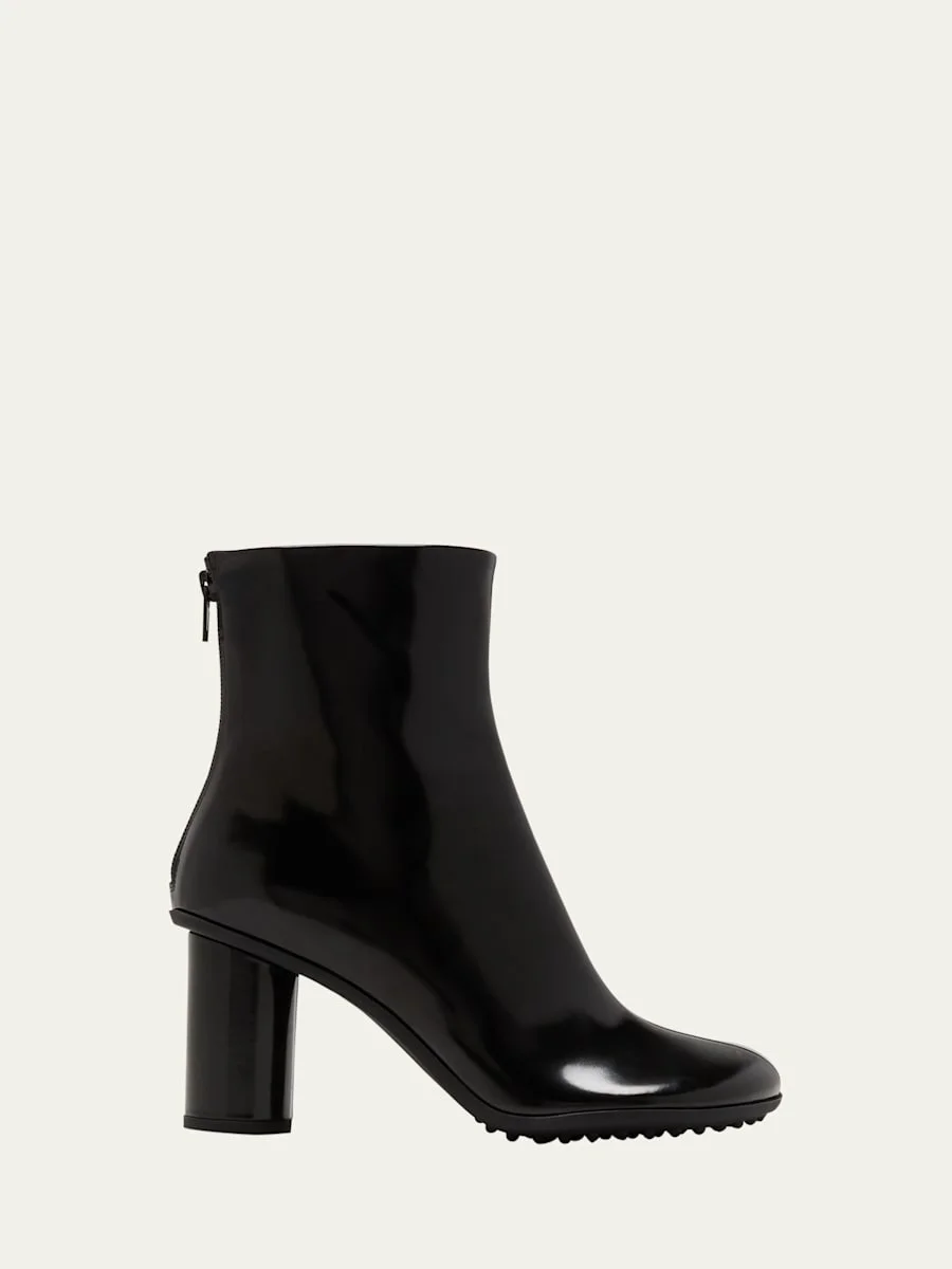 Bottega Veneta "Atomic" ankle boots in shiny patent leather 2.75 in / 70 mm cylinder heel Round toe Back zip eases dress Rubber outsole Lining: Leather Made in Italy