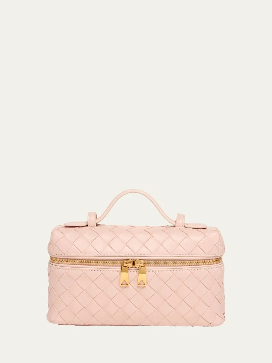 Bottega Veneta "Bang Bang" vanity case in intrecciato leather Top handle Removable, adjustable crossbody strap Can be worn as a top handle or crossbody bag Two-way zip top closure Interior, one slip pocket Approx. 5"H x 9"W x 2"D Made in Italy Online Inquiries: BGS21_V666H| Store Inquiries: #4746116