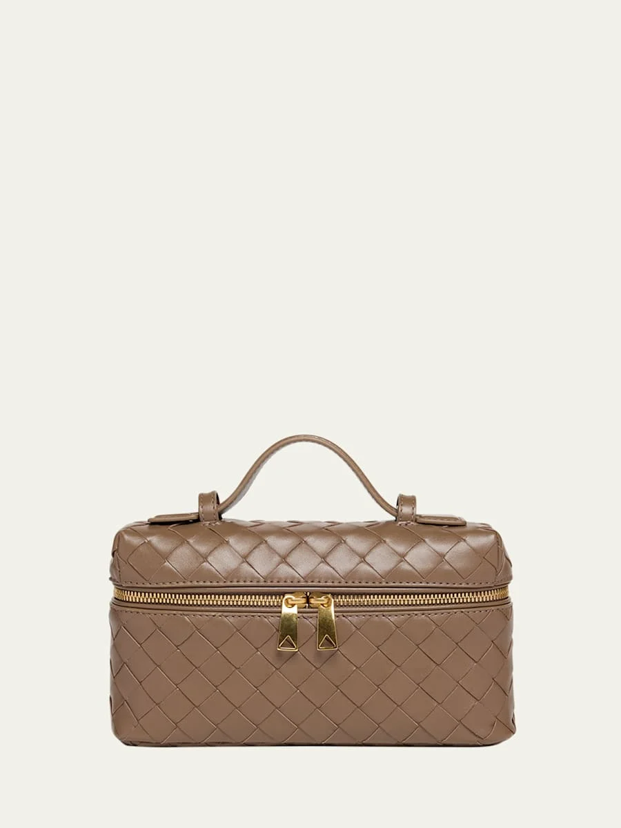 Bottega Veneta "Bang Bang" vanity case in intrecciato leather Top handle Removable, adjustable crossbody strap Can be worn as a top handle or crossbody bag Two-way zip top closure Interior, one slip pocket Approx. 5"H x 9"W x 2"D Made in Italy Online Inquiries: BGS21_V666H| Store Inquiries: #4746116