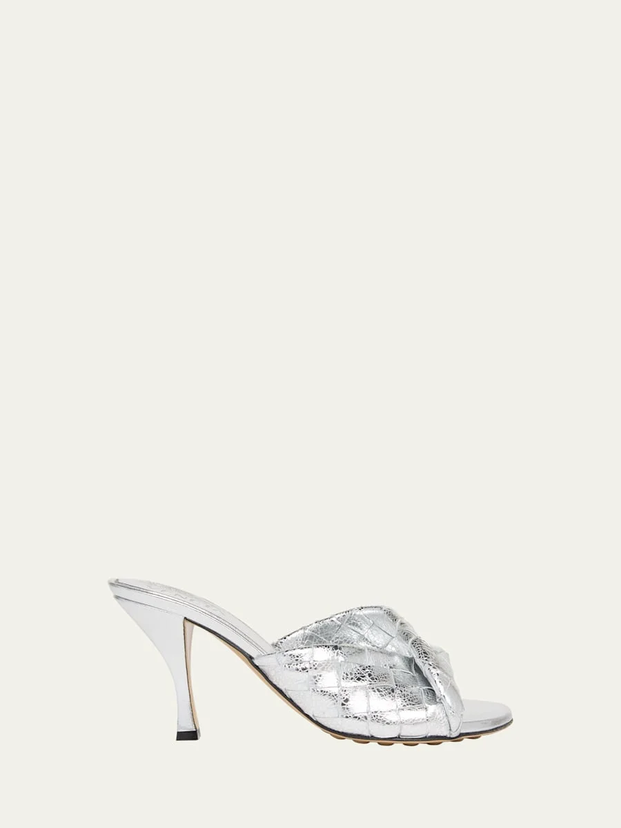 Bottega Veneta "Blink" mules in woven metallic napa leather 2.00 in / 50 mm stiletto heel Open toe Leather/rubber outsole Slip-on style Made in Italy Online Inquiries: BGS21_X6S5U| Store Inquiries: #4925502