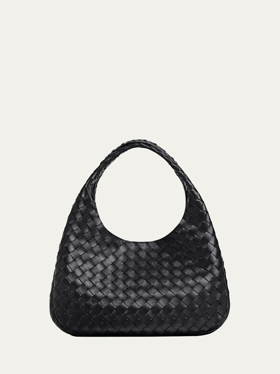 The "Campana" shoulder bag from Bottega Veneta sports an archival silhouette rendered in supple intrecciato leather Interior selftie adjusts the silhouette for versatile shaping Flat shoulder straps Open top with magnetic closure Unlined Approx. 7.9"H x 13"W x 6.5"D Made in Italy