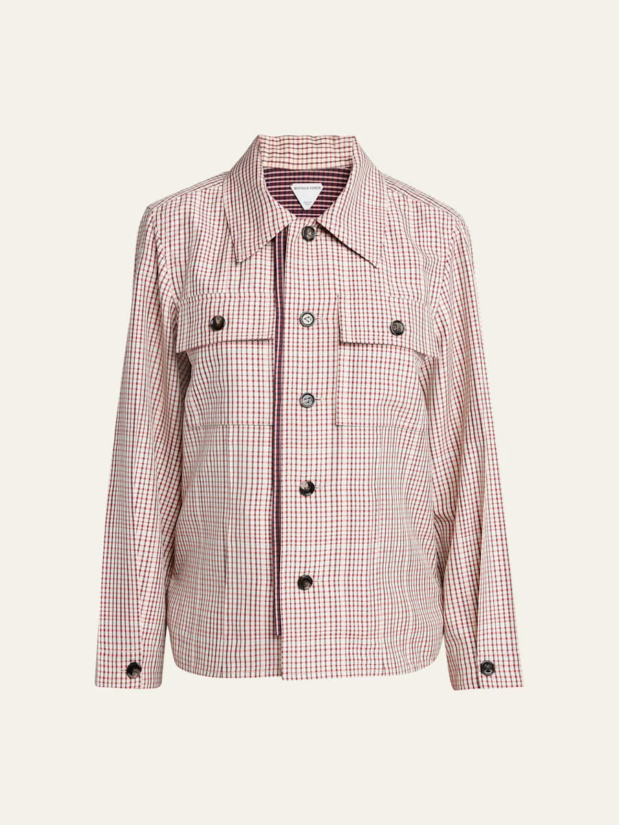 Bottega Veneta shirt with a check print and a contrast double placket detail Point collar; button front Long sleeves; button cuffs Chest button-flap pockets Relaxed fit Shirttail hem Viscose/cotton Made in Italy Model is 5'10"/177cm. Online Inquiries: BGS21_B9NGD| Store Inquiries: #4924805