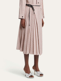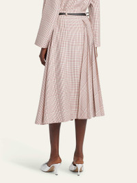 Bottega Veneta light wrap skirt finished with a pleated side panel, check print, and a leather waist belt High waist A-line silhouette Hem falls below the knee Self-tie side closure Viscose/cotton Made in Italy Model is 5'10"/177cm. Online Inquiries: BGS21_B9NGC| Store Inquiries: #4924804