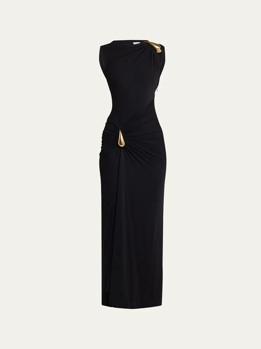 Designed for evening elegance, this fluid matte jersey dress features soft, asymmetric gathering that flatters the figure, adding golden teardrop accents for a touch of sculptural refinement Round neckline Sleeveless Aline silhouette Invisible side zip Hem falls to the ankle Fitted Viscose Made in Italy
