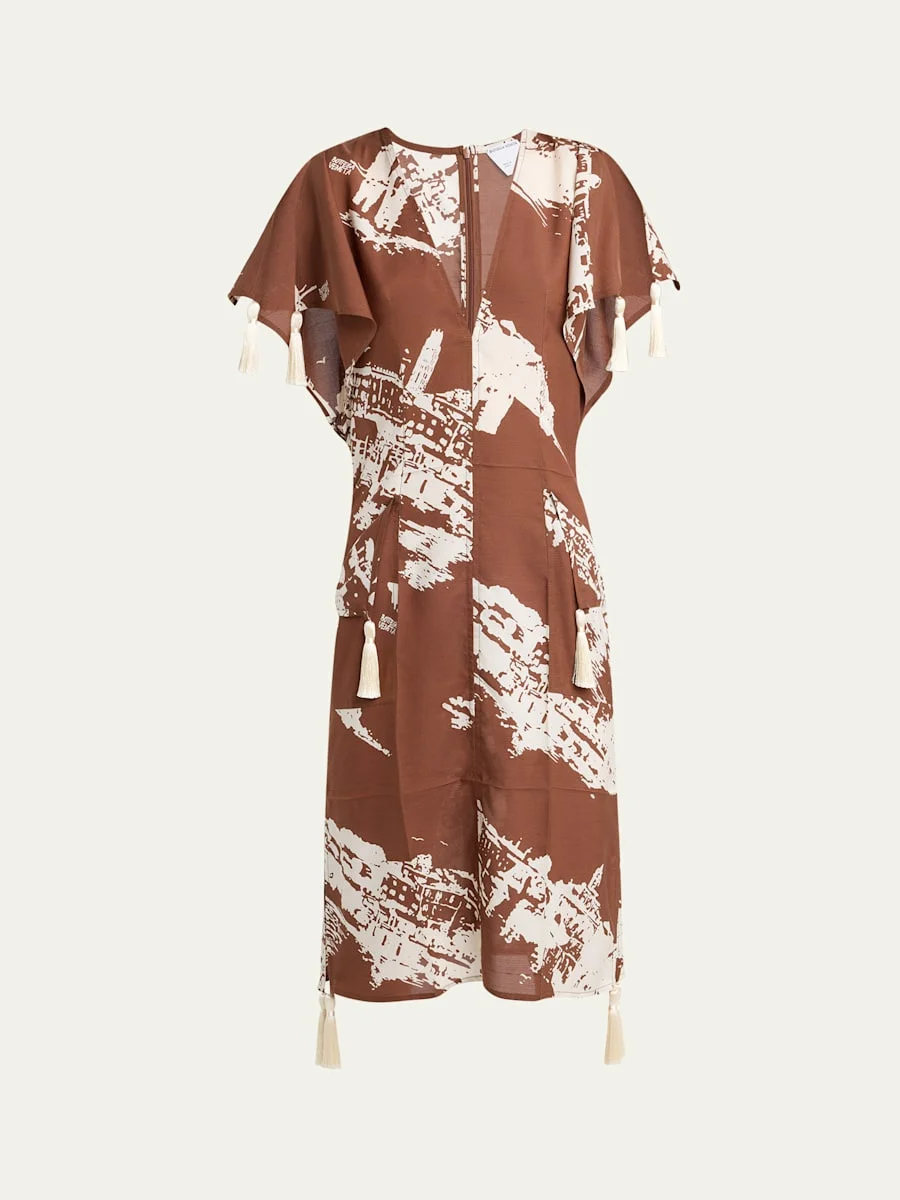 Bottega Veneta silk chantung dress featuring an Italian postcard print and contrast tassel embellishments Plunging neckline Short sleeves; slits Hip patch pockets Knee length A-line silhouette Back zip Silk Made in Italy Online Inquiries: BGS21_BA4B5| Store Inquiries: #5030997