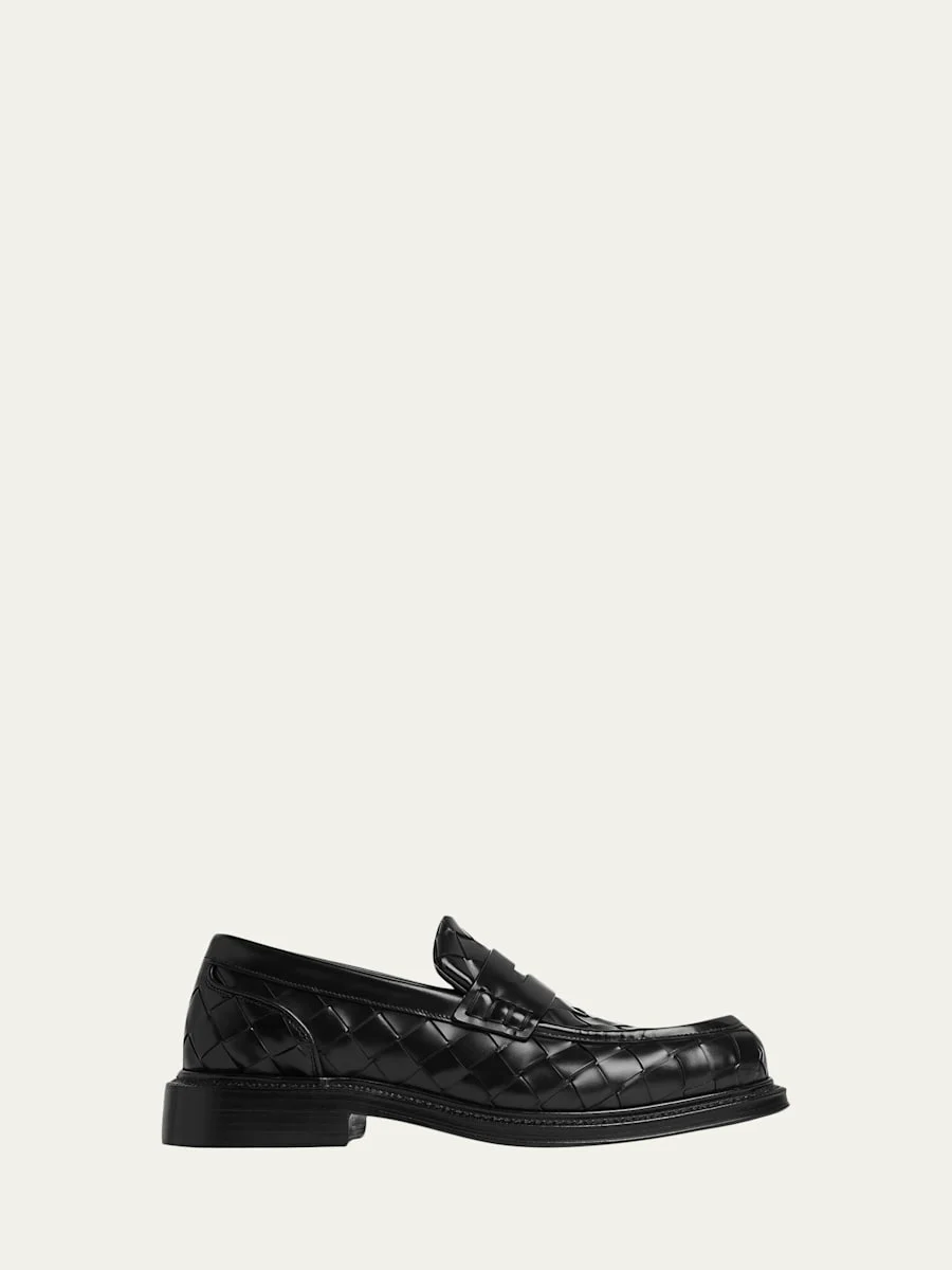 Bottega Veneta's "James" loafers are realized in calfskin leather with allover Intrecciato craftsmanship Stacked flat heel Round toe Notched vamp with keeper strap Slipon style Leather lining Leather outsole with Goodyear construction Made in Italy