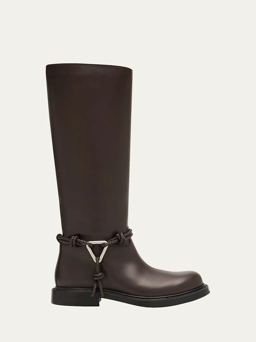 The James knee-high riding boots by Bottega Veneta are crafted from smooth calf leather with coaxial detailing and a signature metal triangle Flat stacked heel Round toe Pull-on style Leather lining Rubber outsole Made in Italy Online Inquiries: BGS21_X7BMH| Store Inquiries: #5363207
