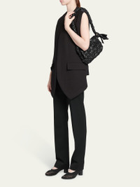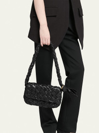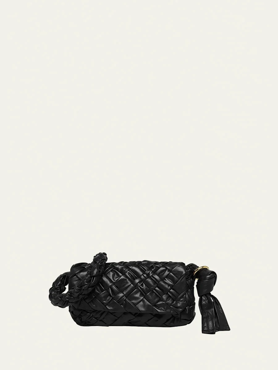 Bottega Veneta "Kalimero" crossbody bag in foulard intreccio leather Shoulder strap with knot accent Flap top with magnetic closure Approx. 7"H x 9.8"W x 2.2"D Made in Italy Online Inquiries: BGS21_V6660| Store Inquiries: #4746077