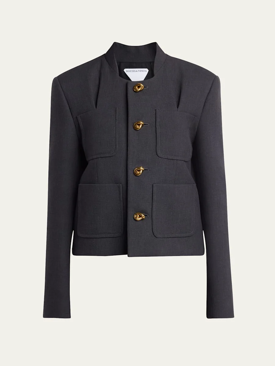 Bottega Veneta light structured cotton jacket featuring signature goldtone knot buttons and shoulder pleat details Band collar; single-breasted front Long sleeves Padded shoulders Front patch pockets Straight fit Hip length Button closure Cotton/viscose/nylon/polyamide Made in Italy Online Inquiries: BGS21_BA4AP| Store Inquiries: #5030980