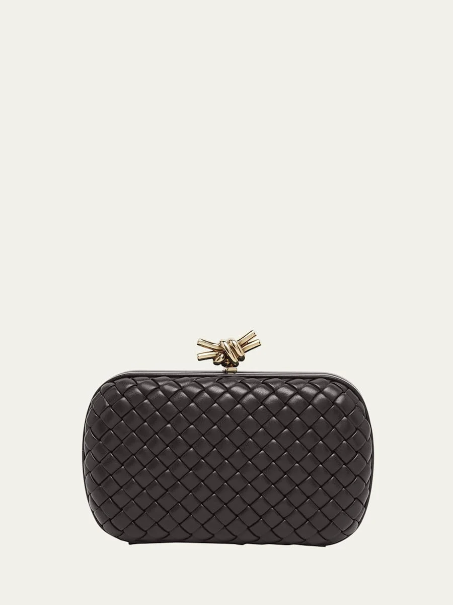 Bottega Veneta clutch bag in intreccio leather Detachable chain shoulder strap Can be worn as a clutch or shoulder bag Knot lift-clasp closure Approx. 4.5"H x 7.5"W x 2"D Made in Italy Online Inquiries: BGS21_V63J1| Store Inquiries: #4681098