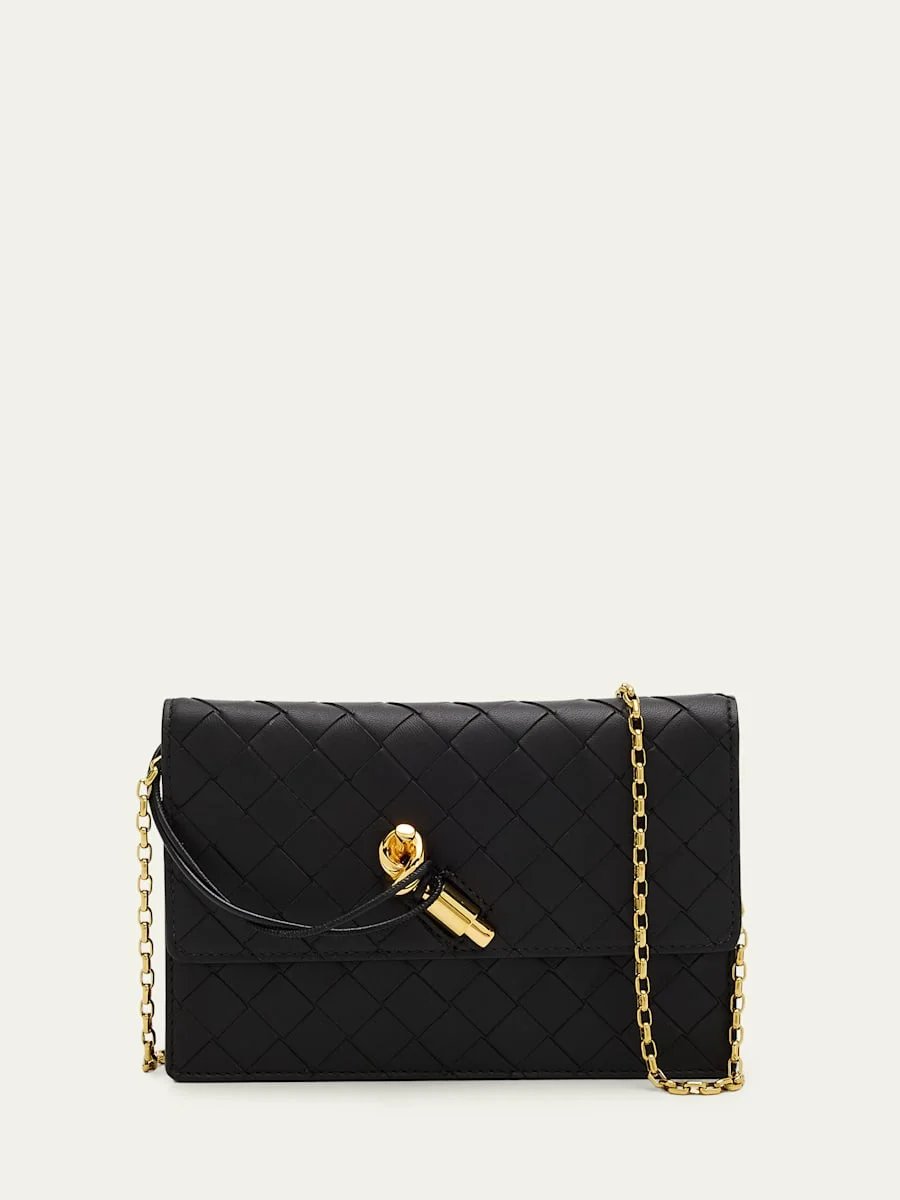 This Bottega Veneta pouch bag is crafted in intrecciato lambskin leather, detailed with the signature knot closure on the front Detachable chain crossbody strap Can be worn as a clutch or crossbody bag Flap top with knot closure Interior, three card slots Approx. 5"H x 7.5"W x 0.8"D Made in Italy