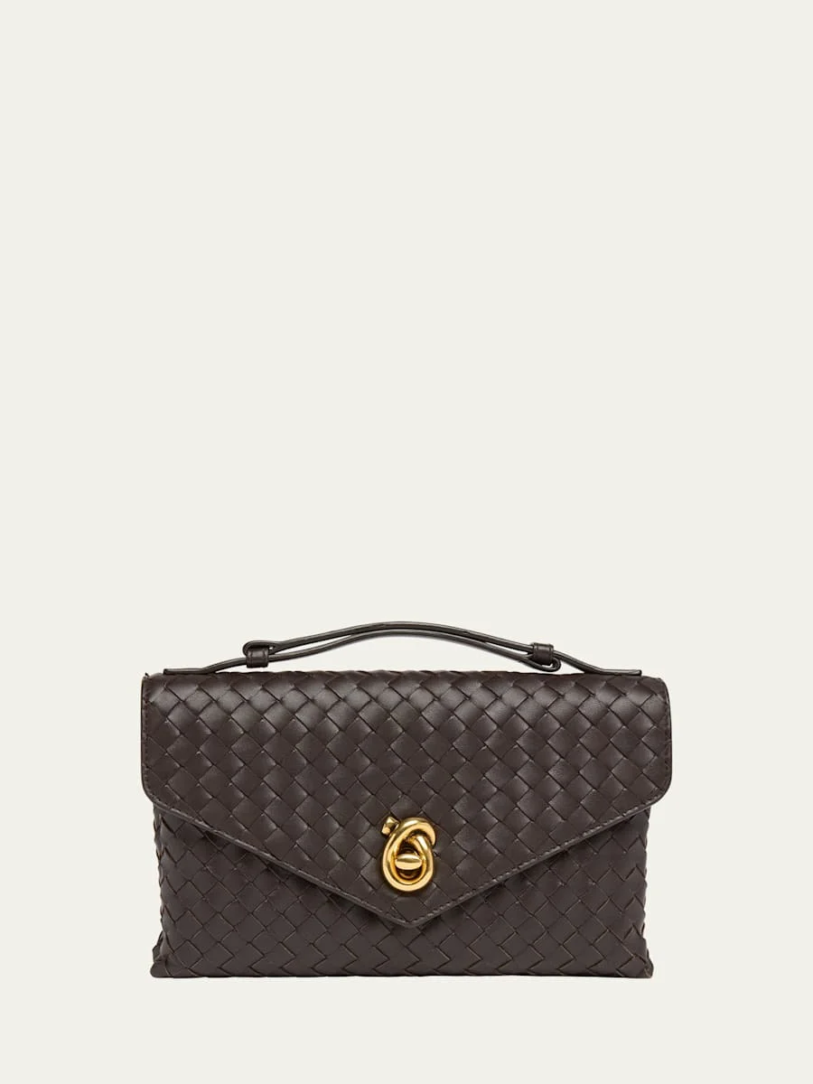 Bottega Veneta "Knot Lock" convertible top handle bag in signature intrecciato leather Adjustable top handle Adjustable shoulder strap Can be worn as a top handle or shoulder bag Envelope flap top with turn-lock closure Exterior, back slip pocket Divided interior Approx. 6.2"H x 9.8"W x 2.1"D Made in Italy Online Inquiries: BGS21_V6GV2| Store Inquiries: #4987035