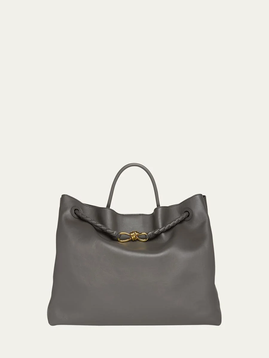 Bottega Veneta "Andiamo" top handle bag in silky calf leather Top handle Adjustable shoulder strap with knot accent Can be worn as a top handle, shoulder, or crossbody bag Interior, one zip pocket, two slip pockets Feet protect bottom of bag Approx. 13.8"H x 16.5"W x 7.1"D Made in Italy