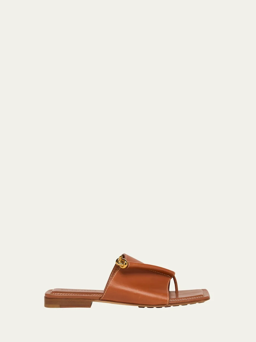 Bottega Veneta smooth leather sandals with signature gold-tone metal knot Flat heel Mid-vamp toe strap Slide style Leather lining Rubber outsole Made in Italy Online Inquiries: BGS21_X6X69| Store Inquiries: #5031221