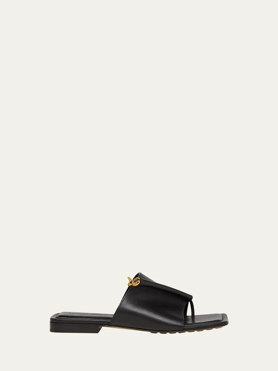 Bottega Veneta smooth leather sandals with signature gold-tone metal knot Flat heel Mid-vamp toe strap Slide style Leather lining Rubber outsole Made in Italy Online Inquiries: BGS21_X6X69| Store Inquiries: #5031221