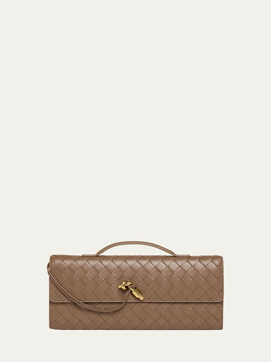 Bottega Veneta "Andiamo" wallet in intrecciato leather Top handle Can be worn as a top handle or wallet Flap top with knot lock Approx. 5.1"H x 12.2"W x 1.2"D Made in Italy Online Inquiries: BGS21_V5YBR| Store Inquiries: #4593138