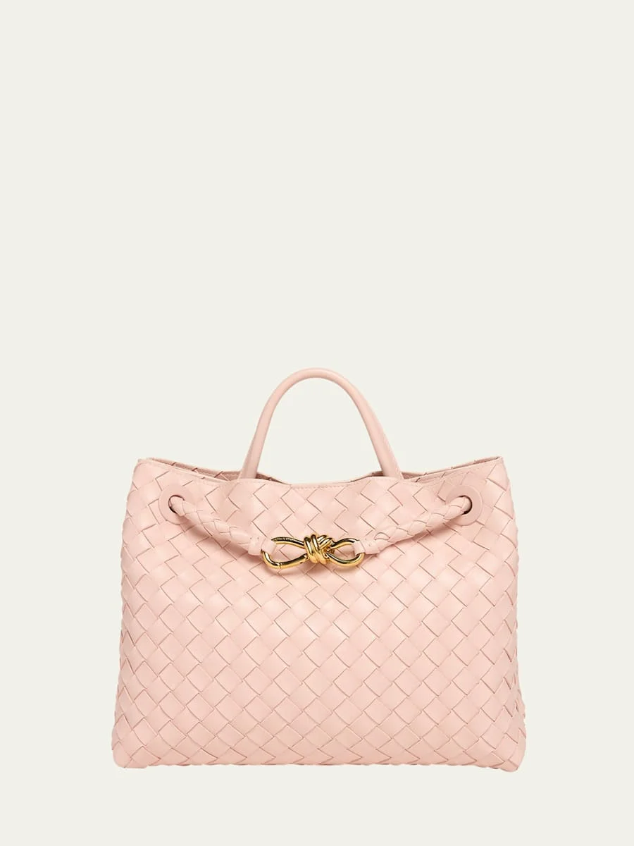 Bottega Veneta "Andiamo" top handle bag in intreccio lambskin leather Rolled top handle, 3.5" drop Shoulder strap Can be worn as a top handle or shoulder bag Open top with magnetic closure; metal knot center strap Approx. 9.8"H x 11.6"W x 4.3"D Made in Italy Online Inquiries: BGS21_V60XJ| Store Inquiries: #4638084