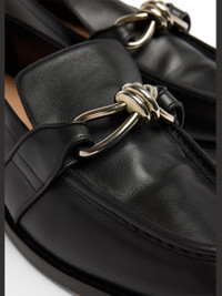 Bottega Veneta "Astaire" loafers in soft calfskin leather featuring the signature knot hardware across the vamp Stacked heel Round moc toe Notched vamp Slipon style Leather outsole Lining: Leather Made in Italy
