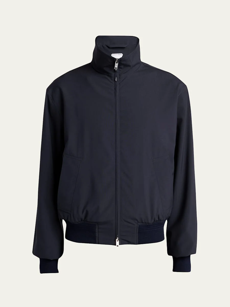 Bottega Veneta jacket in fine wool-nylon blend Stand collar Two-way zip closure Broad welt pockets Long sleeves Ribbed cuffs and waistband Wool/nylon/polyamide/elastane Made in Italy Model is 6'1"/185cm. Online Inquiries: BGS21_NCPVC| Store Inquiries: #4925773