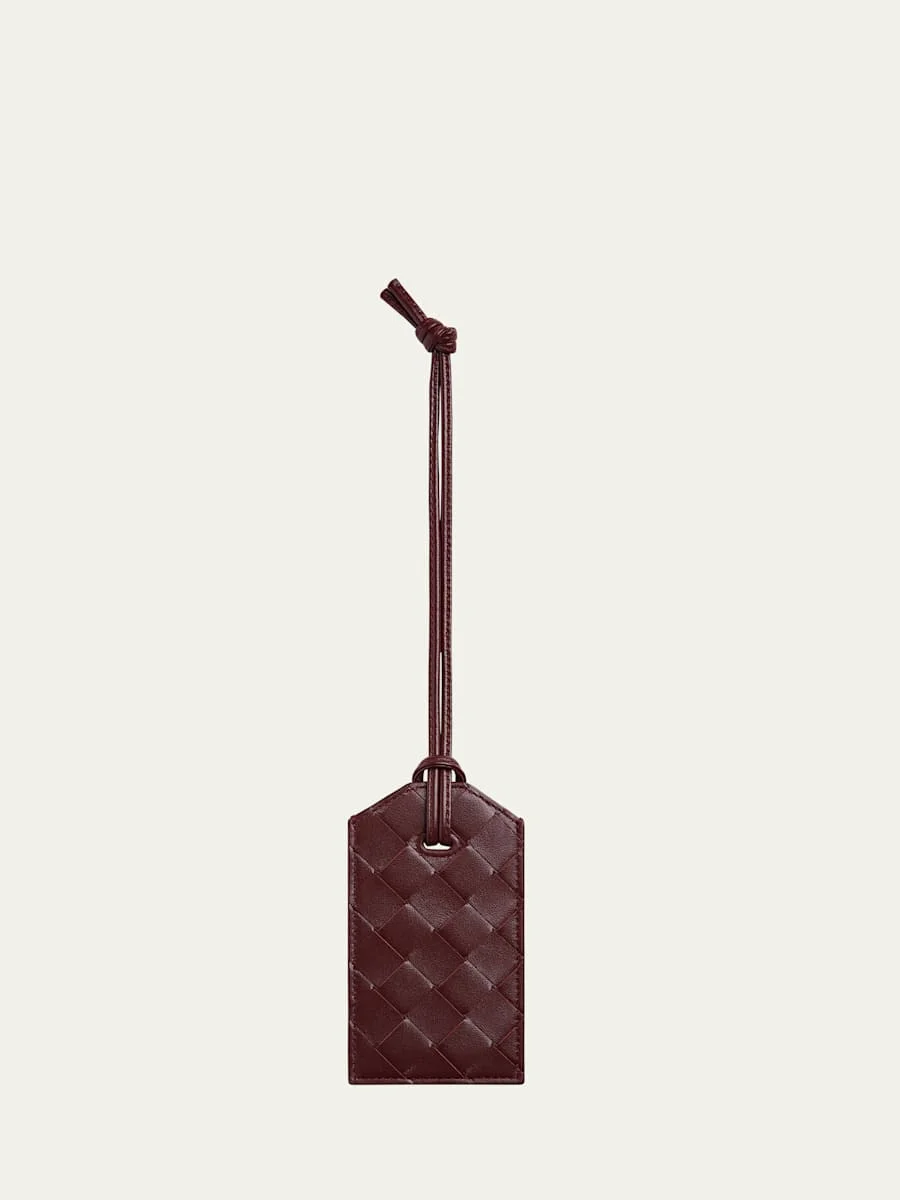 Bottega Veneta tag holder with strap in Intrecciato calfskin leather Leather strap to be easily attached to any handle Window to display the paper tag Approx. 4.5"H x 2.6"W Made in Italy Online Inquiries: BGS21_NCQUA| Store Inquiries: #4930783