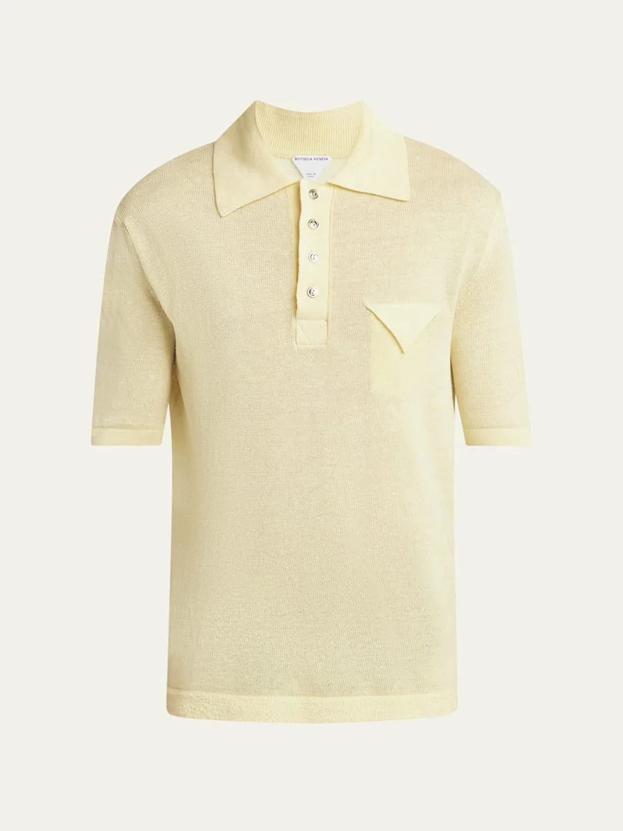 Bottega Veneta sport shirt in linen-knit Spread collar; four-button placket Chest pocket Cuffed short sleeves Cuffed hem Pullover style Linen/cotton/polyamide Made in Italy Model is 6'1"/185cm. Online Inquiries: BGS21_ND06H| Store Inquiries: #4510254