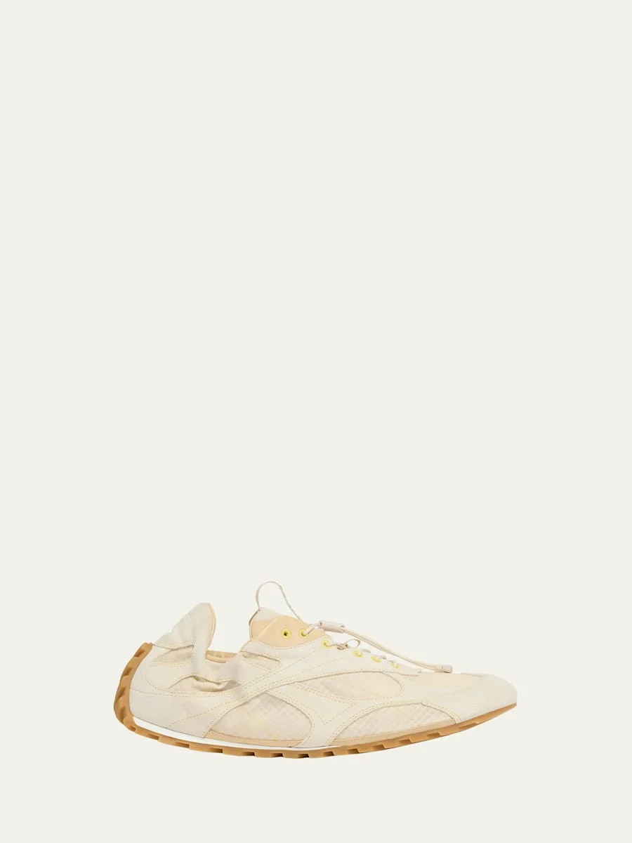 The "Orbit Flash" sneaker by Bottega Veneta is crafted from soft suede and lightweight nylon, featuring smooth leather trims and an elasticated back. Flat heel Rounded toe Drawstring vamp Rubber outsole Lining: Leather Trim: Leather Made in Italy