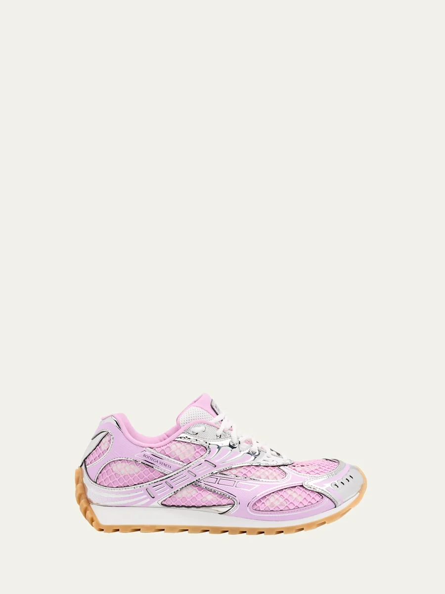 Bottega Veneta "Orbit" runner sneakers in technical Phifertex® vinyl mesh with metallic overlays Flat heel Reinforced round toe Laceup vamp Logo patch at the tongue Padded collar Logo lettering on the side Rubber outsole with a graphic design Made in Italy